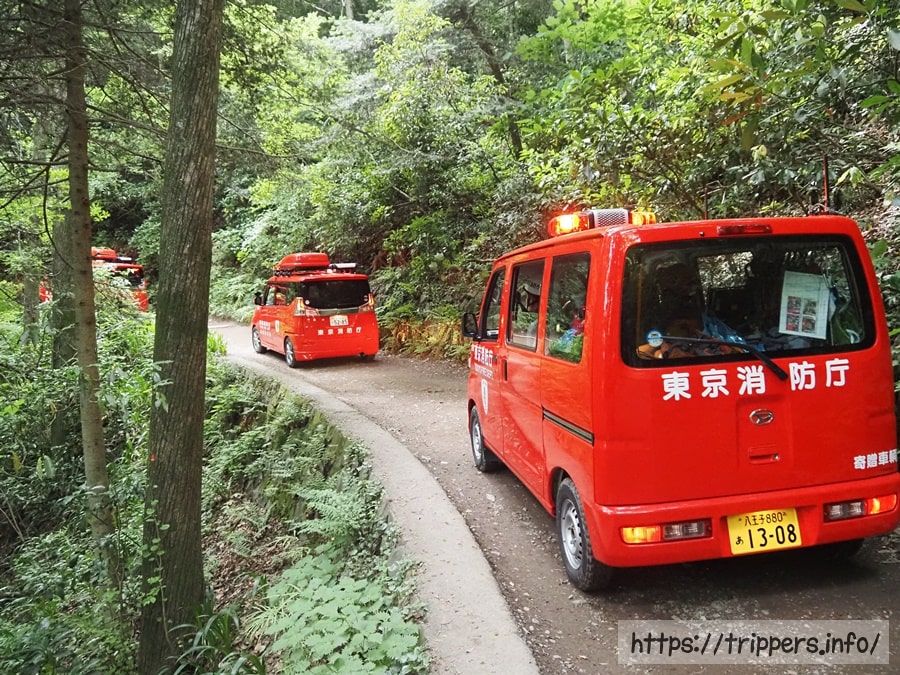無線通信でやり取りをしていた消防団の人々です。暗くなり、人通りのない道でまだまだ活動中でした。高尾山は登山というよりハイキングが楽しめる観光地のような印象ですが、4号路で滑落して助からなかった事故が過去に発生していたり、危険はあります。