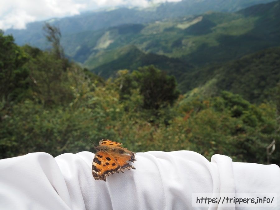 ヒオドシチョウが自分の周りを飛んでいたので、じっとしていたらとまってくれました。蝶や蛾はどちらかというと苦手です。以前、八重山諸島で見たオオゴマダラの金色に輝く蛹はとても美しかった記憶があります。金の蛹とは、日本にも珍しい昆虫がいるのだと思いました。