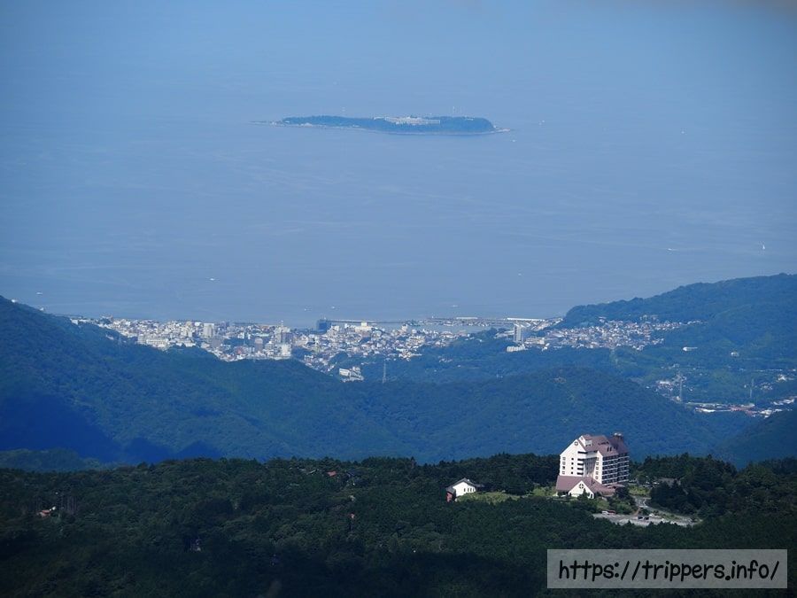 登山道では初島が見えました。手前に見える建物はホテルハーヴェスト 天城高原です。