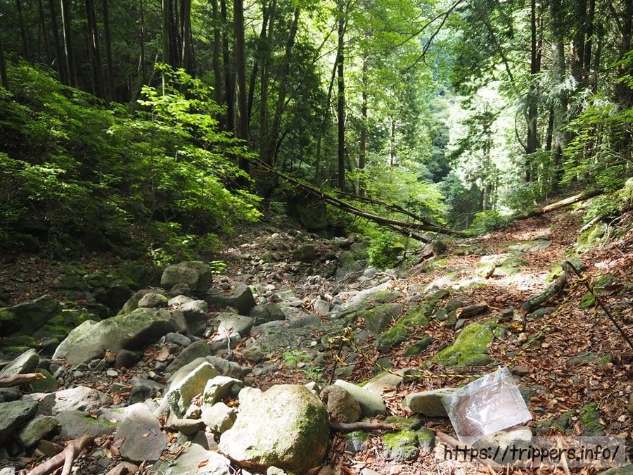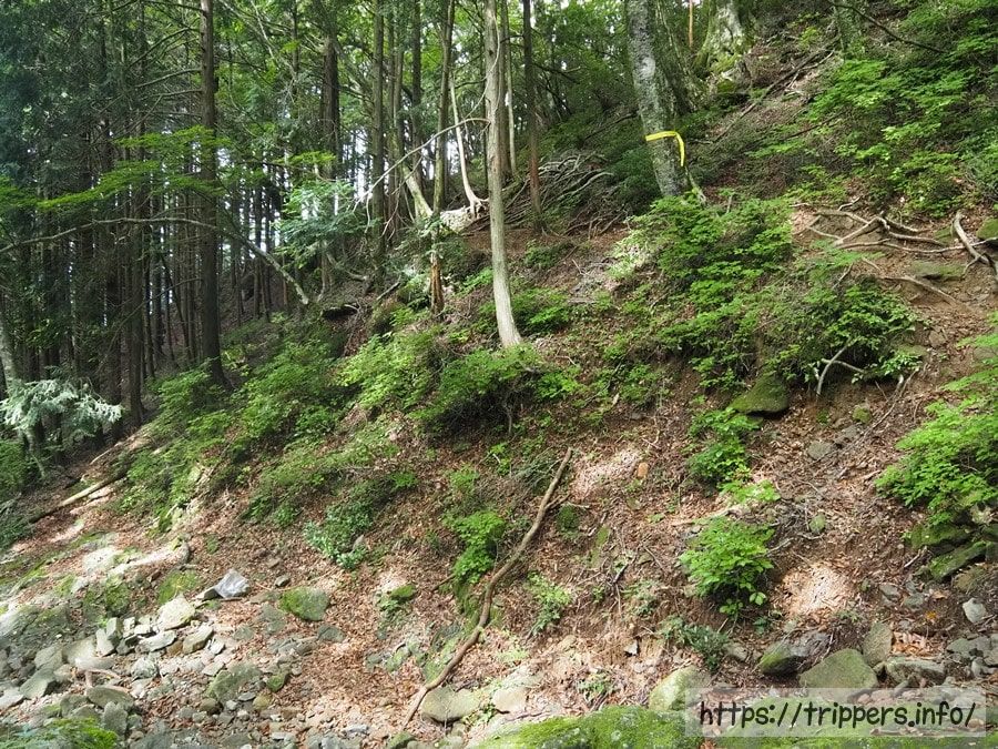 良く分からないことを言って不思議ちゃんに入り浸っていたせいか、迷子事案が発生しました。ここは左から右へ通過してしまいました。ちゃんと道が続いていましたが、そっちはルート外になります。周囲に溶け込んで見えない虎ロープと色褪せて存在感を消し去った紙に気が付かずに進んでしまいました。