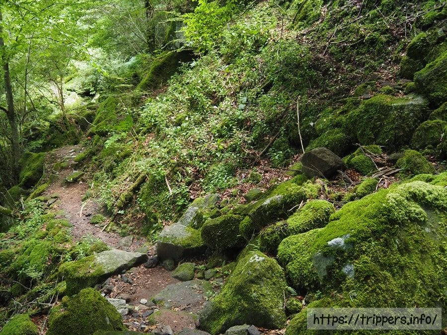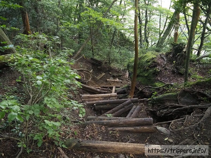 階段がありましたが、この道ではなく隣の道を歩いて来ました。今まで大勢の人が色んな場所を歩いたためか、複数の登山道が出来上がり、並列し、交錯していました。元々存在していた登山道は比較的歩きやすいですが、それ以外は歩きにくいです。どうやら、昔からある登山道とは別のルートを歩いていたようです。
