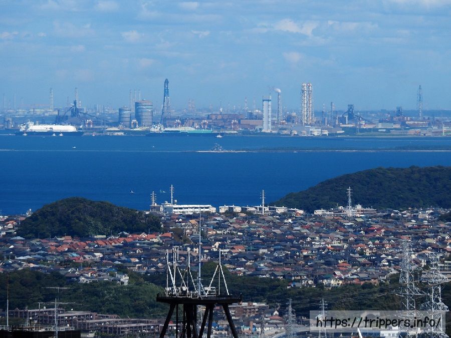 展望台から見た工場と東京湾です。山頂へは車で来ることも可能なようで、工場夜景の撮影スポットになりそうです。