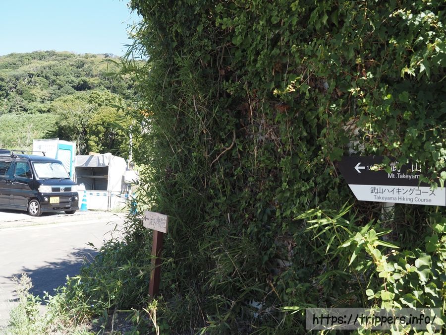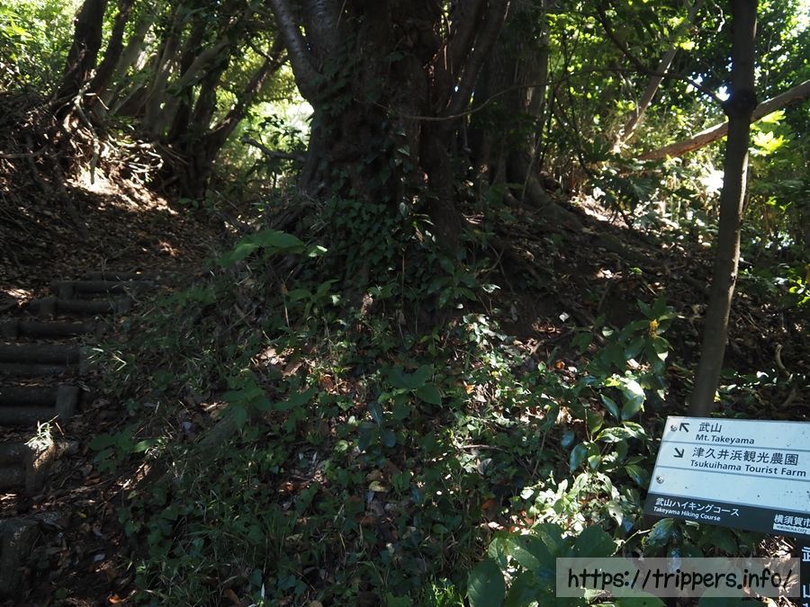 津久井浜駅から歩いてくると、最初の分岐になります。どちらも武山ハイキングコースになり、右に行くと三浦富士へ向かってしまうため、左を進みます。