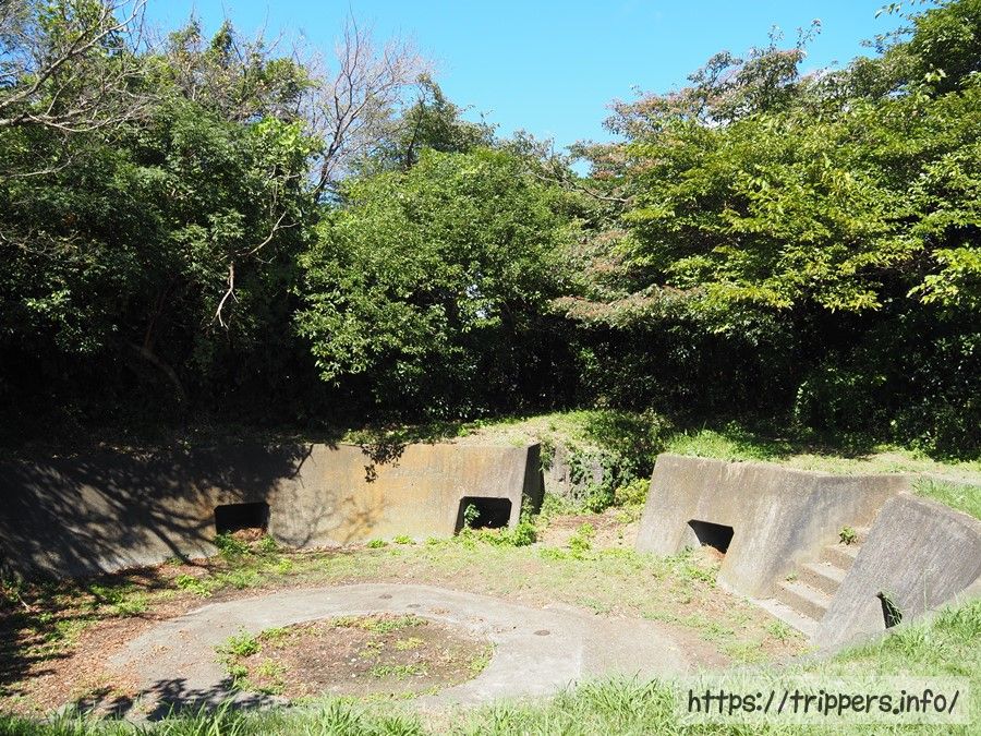 昭和初期に砲台が存在した跡がある砲台山に到着しました。元々の名前は大塚山でした。8つある四角い穴は弾薬の格納庫だったと言われ、同じ横須賀にある猿島にも砲台跡があったりします。