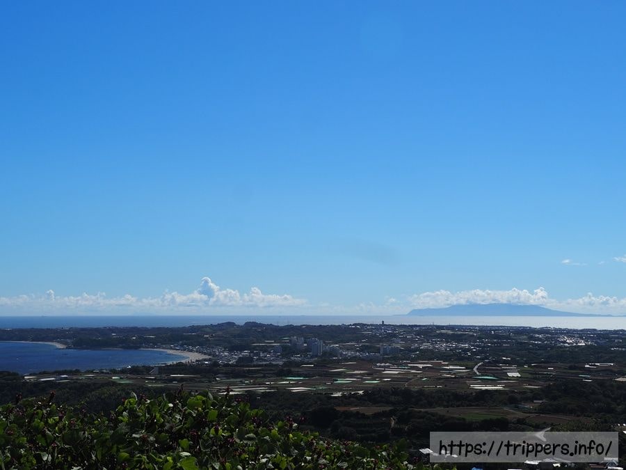 三浦富士を目指して歩いていると三浦海岸と伊豆諸島の大島が見えるポイントがありました。