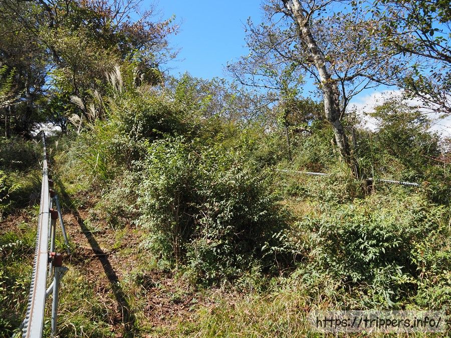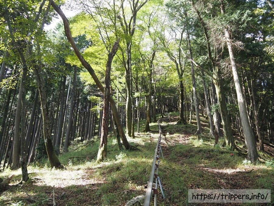 モノレールに沿って登っていきます。バリエーションルート扱いのようですが、一般登山道と同じ感覚で歩けます。モノレールが設置できるような場所なので、四つん這いで登ったり、崖があったりなんてことがないことは想像できます。また、地図アプリで等高線の幅は確認します。幅は狭くなかったので大丈夫です。