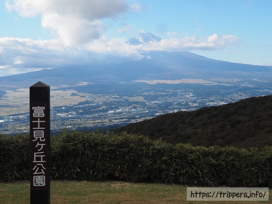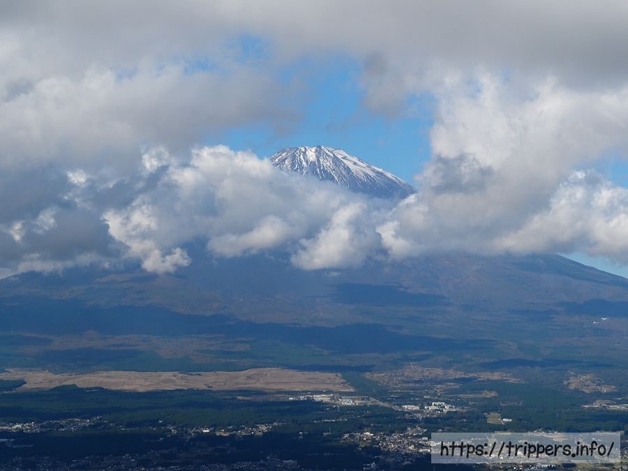 富士見ヶ丘公園から山頂が冠雪した富士山を眺めますが、雲が一部を隠しています。また今まで歩いてきた外輪山を振り返ると、山の展望がありました。