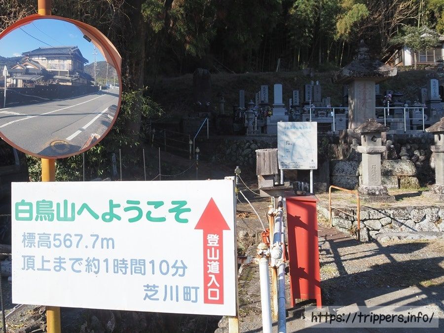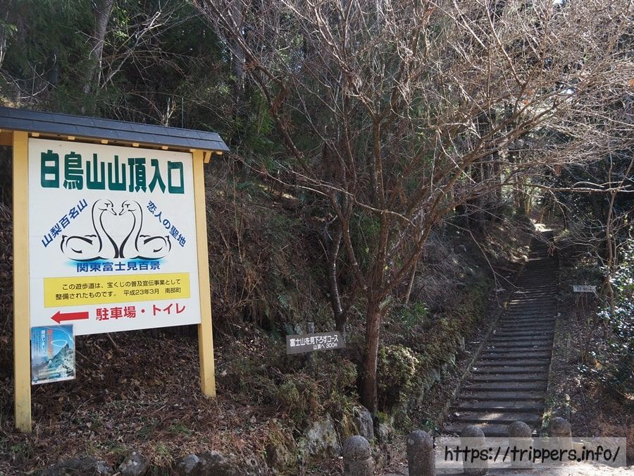 白鳥山森林公園駐車場にある登山口に到着しました。ここから芝川駅まではずっと舗装された車道になります。トイレがあるので、立ち寄りました。