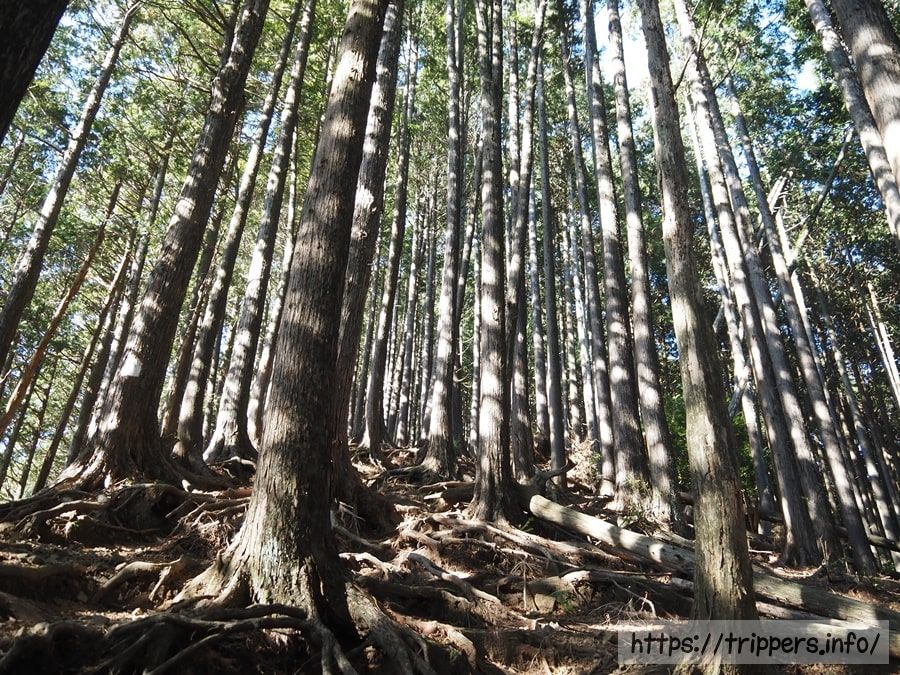 標高が低い場所は竹林になっており、それ以降はスギやヒノキの雑木林です。山頂付近は白鳥山森林公園とも呼ばれているようです。