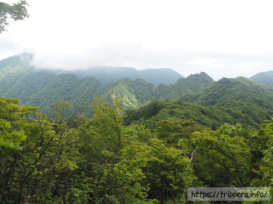 鋸岳展望台では鋸岳の険しい山容が見えました。一番右には、今日訪れる予定の蓬莱山でしょうか。富士山が見える展望ポイント、富士見台がこの先にあるのですが、富士山は既に雲で隠れてしまいました。