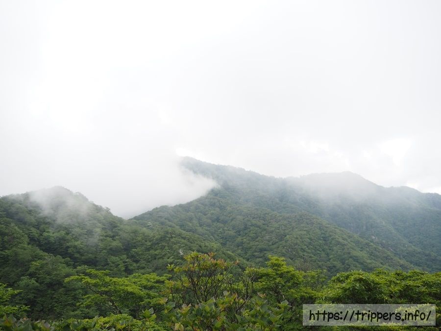 天気は晴れだったのですが、ガスってしまいました。それでも暑いので、ハンディー扇風機で涼みながらゆっくり登っていきます。