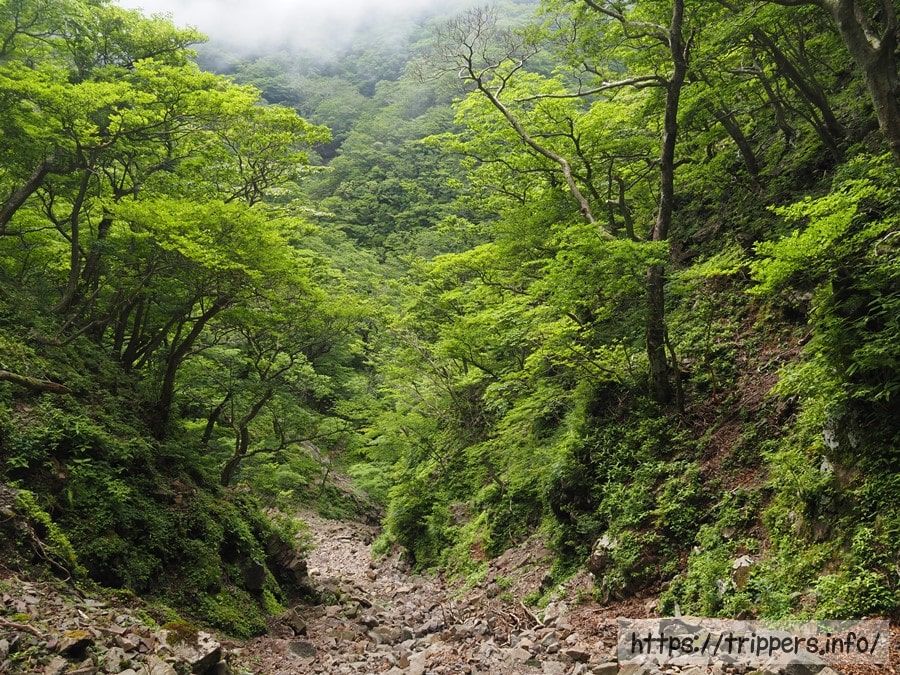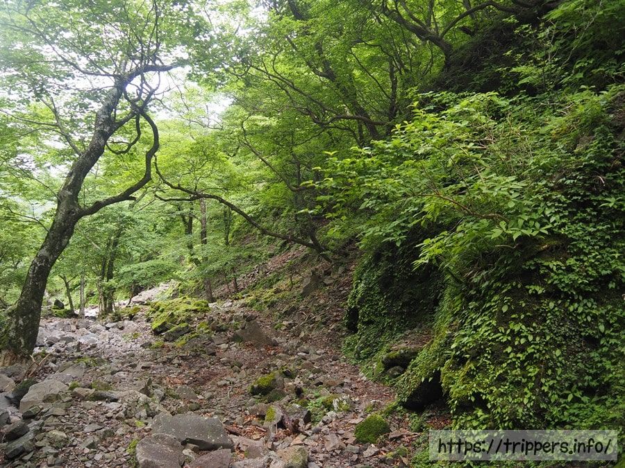 枯れ沢をずっと歩くようなルートで、行きと帰りでは景観が大分違いました。どこかにアオホオズキがあって、ちょうど開花していそうと思いましたが、緑一色の切れ落ちた崖では見つけるのは難しそうです。