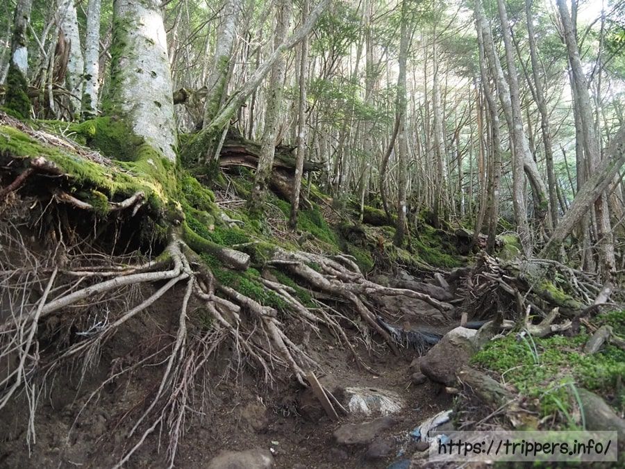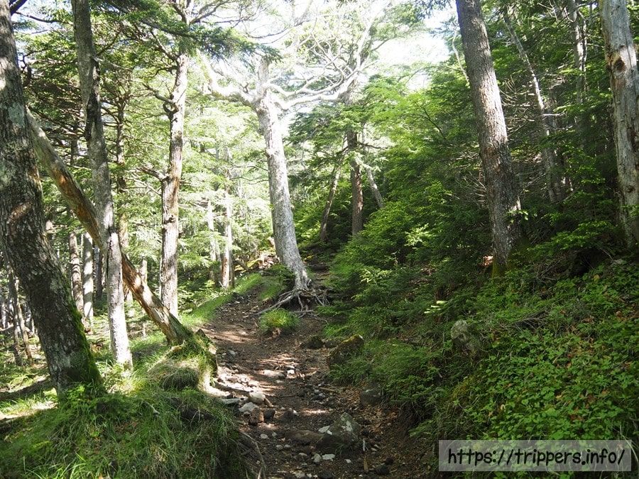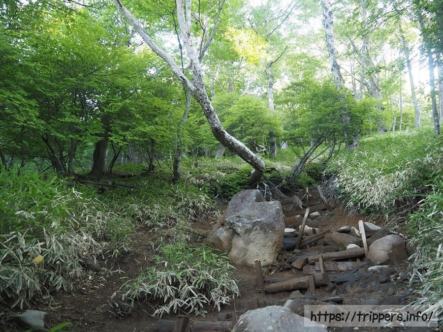 登山道は笹が生い茂る場所もあれば、苔の森みたいな場所もあります。ヒカリゴケが自生するのですが、見逃してしまいました。またオコジョに出会えないか目をキョロキョロします。日光白根山ではオコジョの目撃情報が多数あるようです。