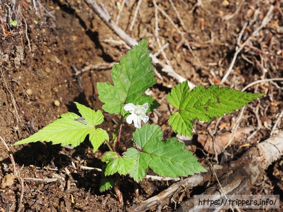 ミツバオウレンを見つけました。山野草としてオウレン系統は人気がありますが、周囲の登山者は見向きもせずに登っていくばかりです。こちらは、萼片が通常の5枚ではなく4枚でした。他にも6枚や7枚もありました。残念ながら八重咲き個体は見つけられませんでした。