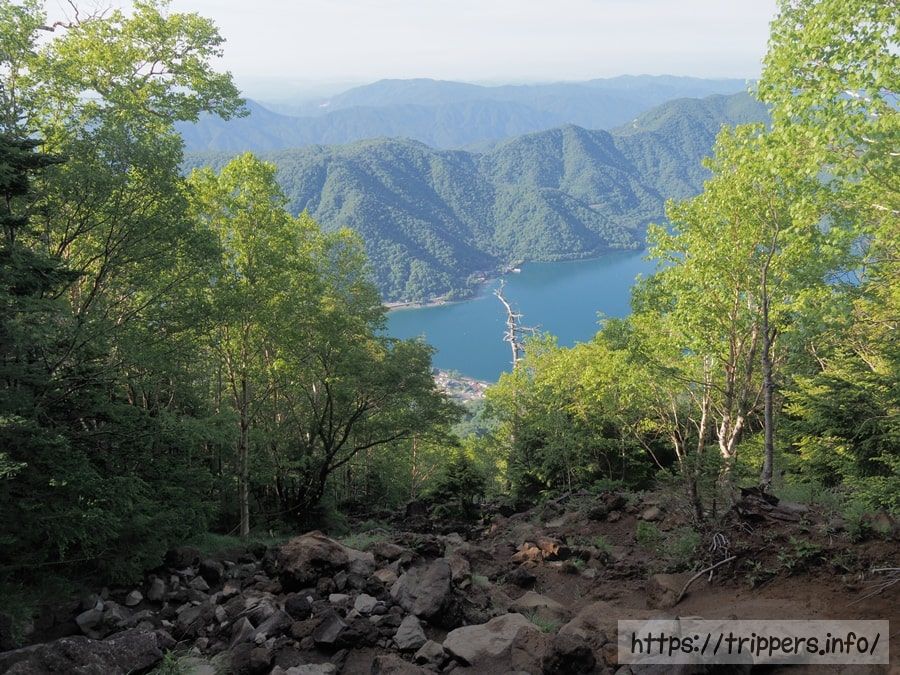 中禅寺湖が眼下に見えてきました。岩が多い道もありますが、前日の雨で岩が滑りやすくなっておらず、良かったです。水分の多い泥の方が滑りやすいです。