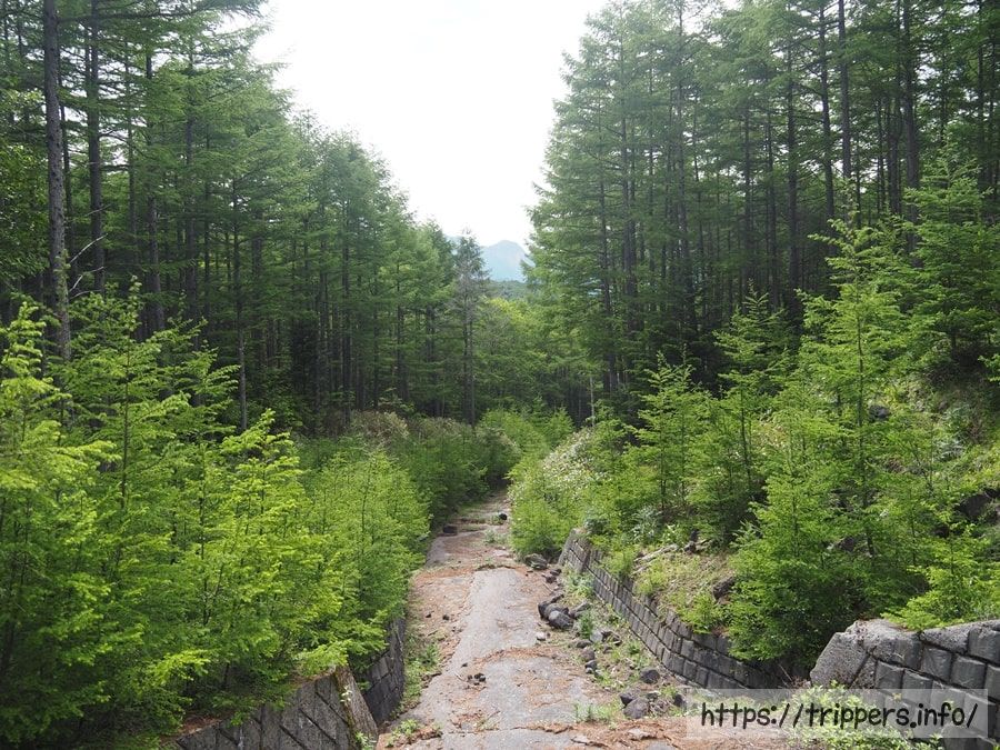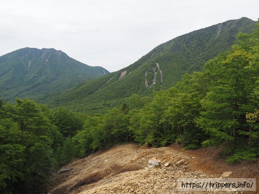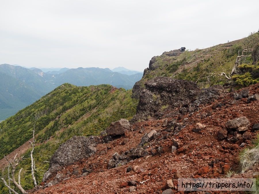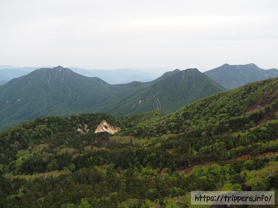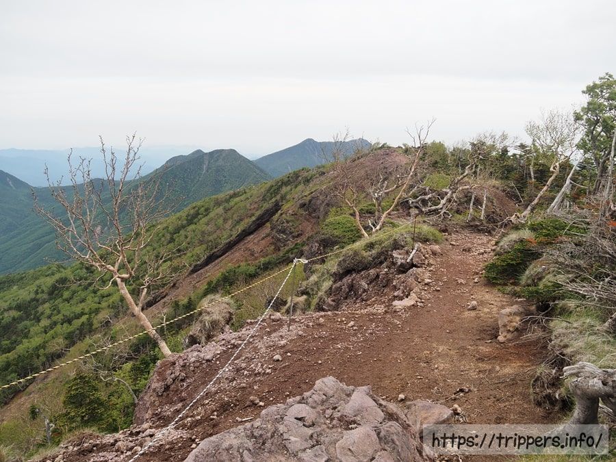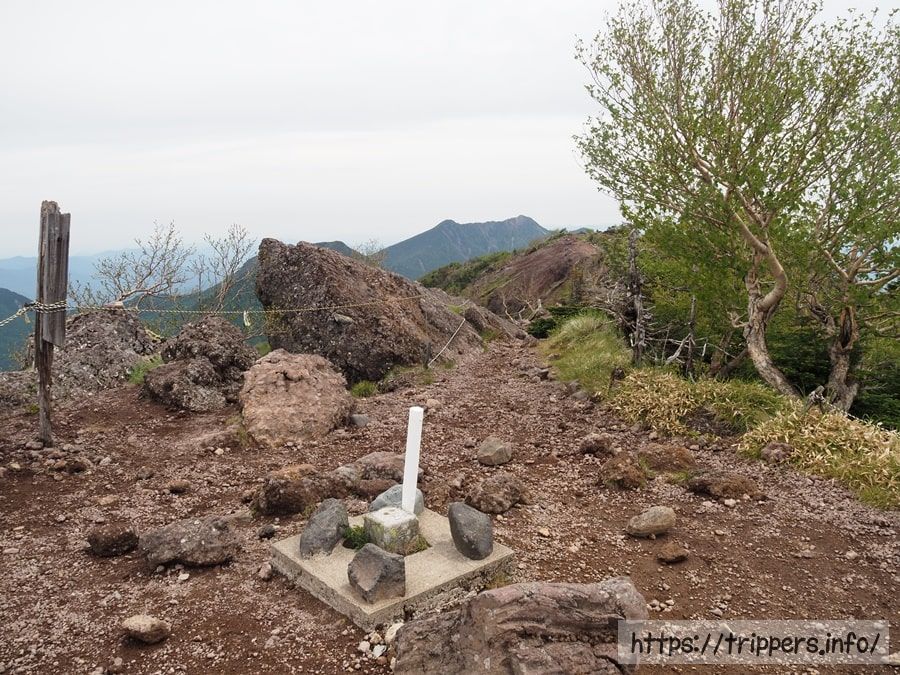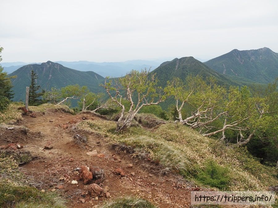西側を向くと、目の前には戦場ヶ原へ続くルートです。立ち入らないようになっていましたが、様々な人が歩いた記録があるため、明確な道が存在するのかもしれません。奥の山塊は日光白根山です。