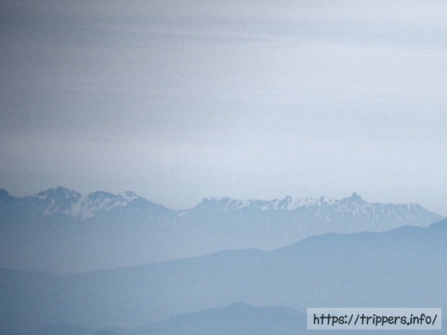 なんとなく撮影していたら、北アルプスの槍ヶ岳や穂高連峰が映っていました。一度見たら忘れない唯一無二の山容なので、同定しやすいです。