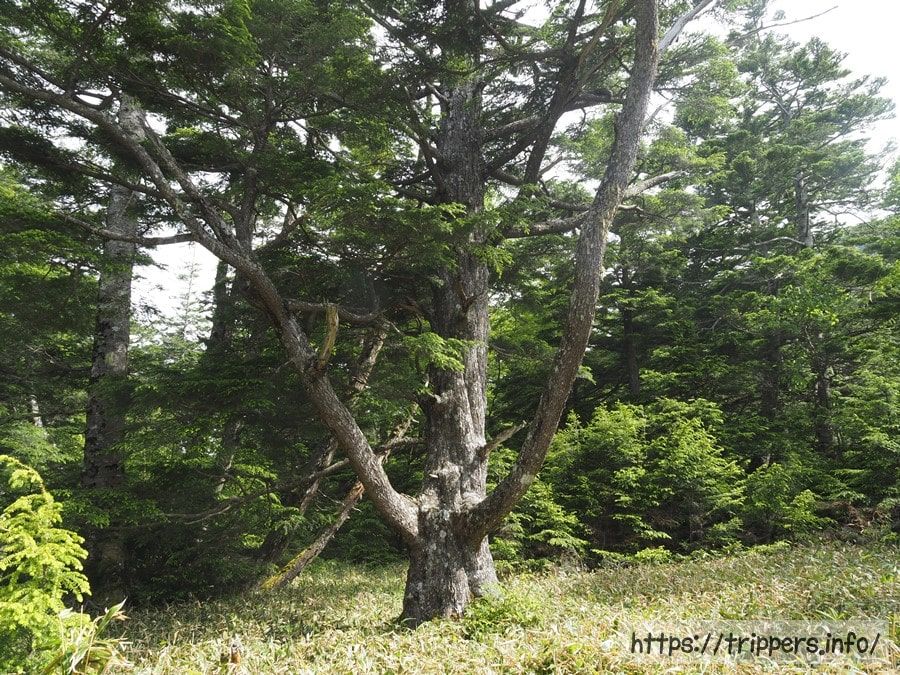 目立つ立派な木が見えたら登山道はもうすぐ終わりになります。