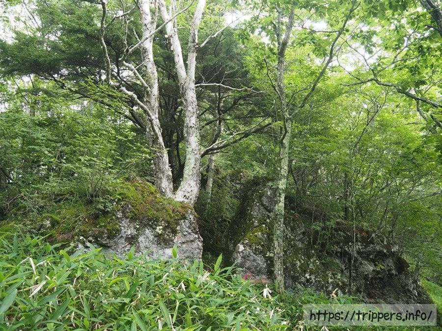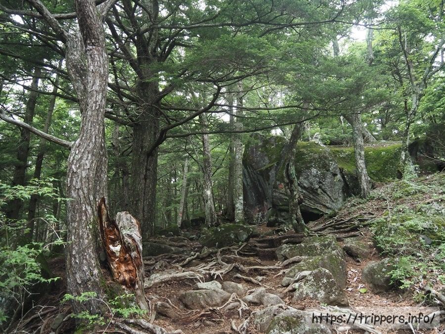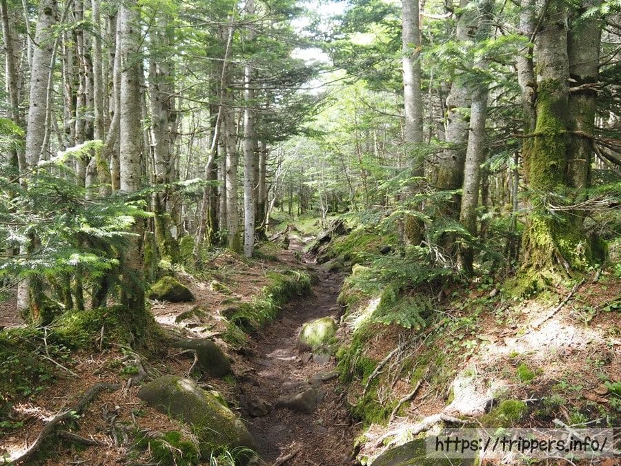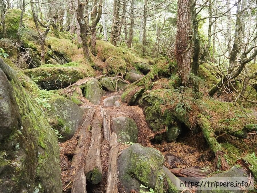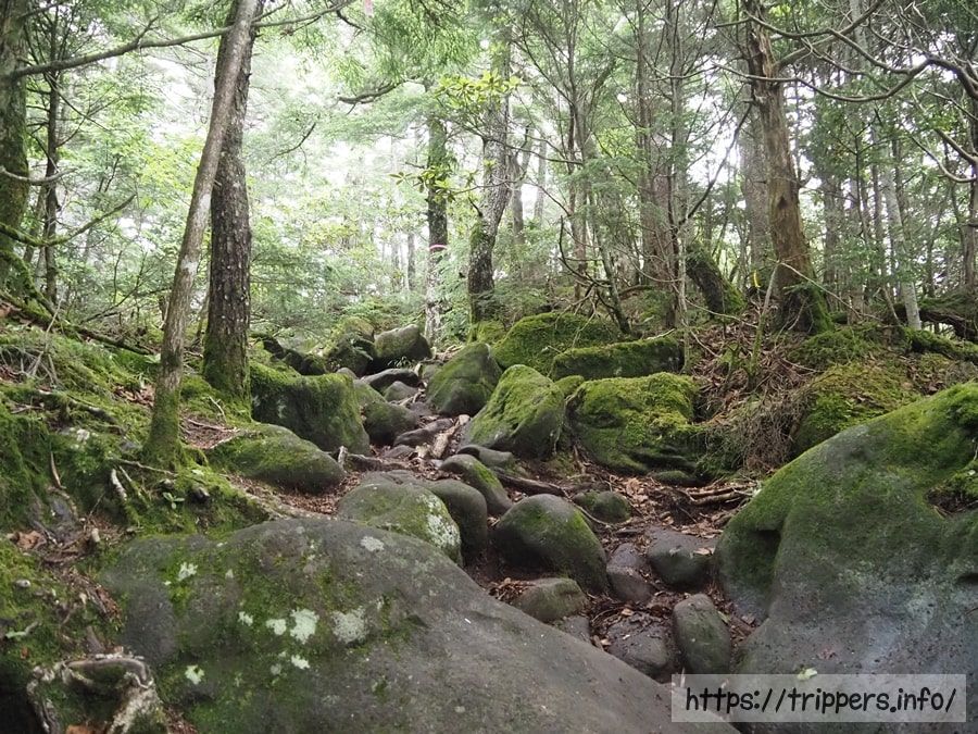 登山道が苔むしてきました。岩が多くなってきたので、転倒しないように注意します。