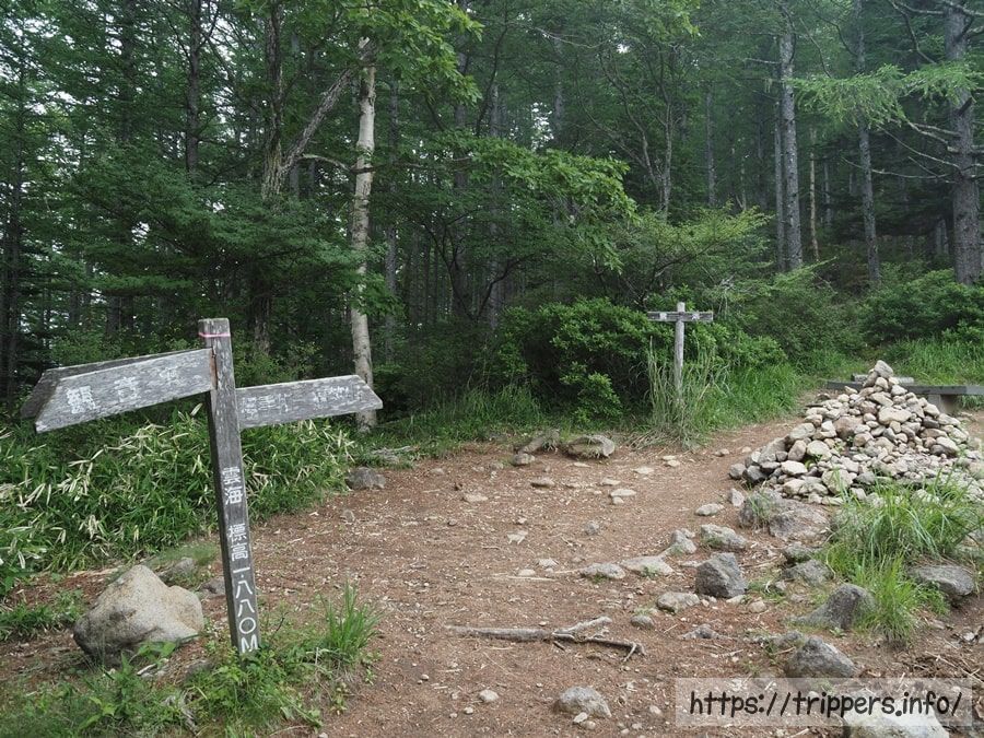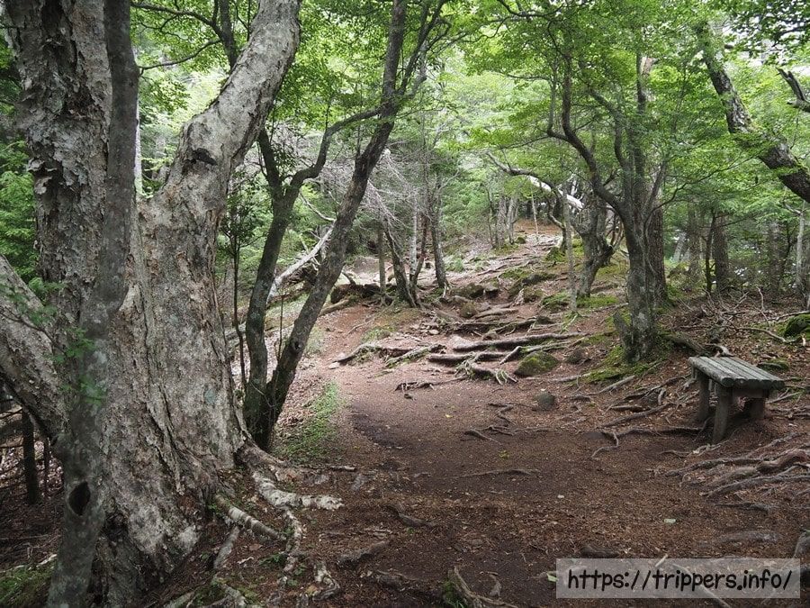 ベンチを見つけたので、休憩します。荷物が重すぎて、かなり大変です。翌日の権現岳へは、テントやその他の荷物はテント場に置いたまま、最小限の荷物で権現岳をピストンするのが良いかもしれません。軽量コンパクトなアタックザックを持参しています。