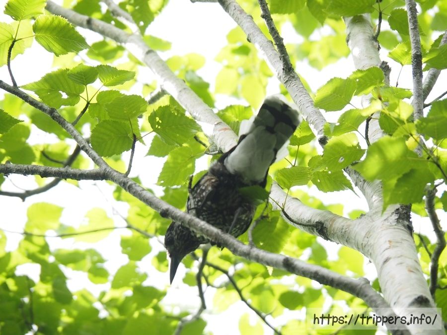 ホシガラスの特徴的な声が聞こえたので、頭上を見上げると数羽が木に留まっていました。ただしかなり上空のため、姿が枝で隠れがちでした。