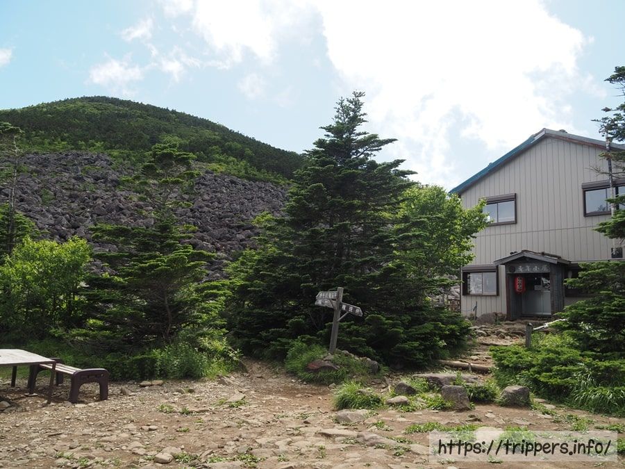 青年小屋に到着しました。小屋の左手に見えるのが編笠山で、今日宿泊する人は今日登ってしまう人が多いようです。ただ午後から登っても、そこまで展望が綺麗に見ることは難しいと思います。なので翌日まで編笠山は登頂しません。