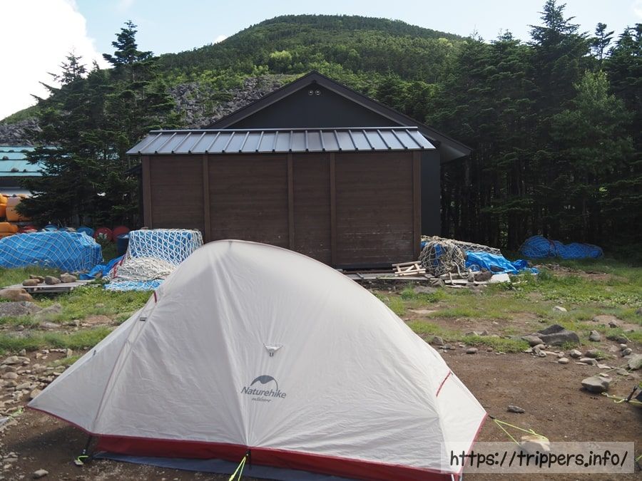 テント場は、地面が綺麗に整地されて、小石がほとんどない場所が残っていたので、そこでテントを設営しました。2人用のテントを1人で使うため、テントの中はゆったり空間です。