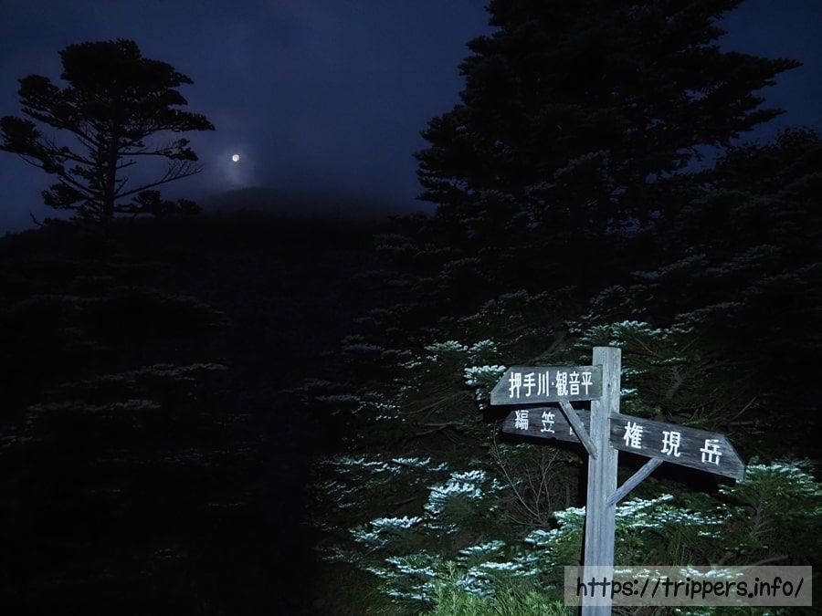編笠山へは岩場を登っていきます。月明かりがあるものの、暗いためヘッドライトを使います。それでも岩に書かれた登山マークの「〇印」を上手く見つけられず、右往左往しながら進みました。
