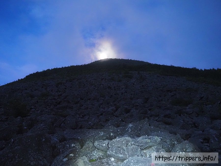 権現岳の山体の背後から太陽の明かりが漏れてきました。つまり太陽が昇ると権現岳は逆光になってしまいます。なるべく急いで山頂を目指します。