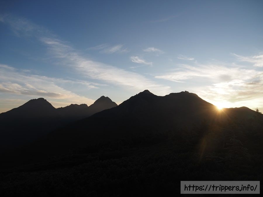 日の出の時間です。権現岳の右側から太陽が姿を見せていました。ちなみに中央の少し尖った山が西ギボシ・東ギボシであり、その右の平らな場所が権現岳です。
