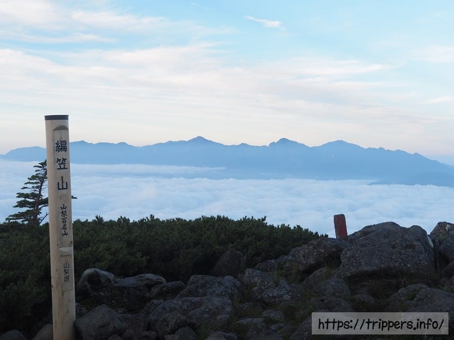 標高2,524mある編笠山の山頂に到着しました。山頂には誰もいません。途中で1名だけ来るのですが、写真を短時間で撮影し、下山してしまいます。本来なら大勢の登山者がいて、ご来光を待っていそうですが、一人きりの世界でした。