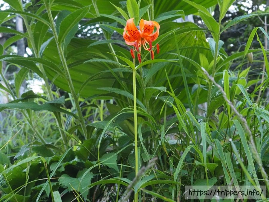 テント場に戻ったらテントを片づけます。青年小屋ではクルマユリが咲いていました。重たい荷物はそのままテント場の端っこに置いて、権現岳へ向かいます。