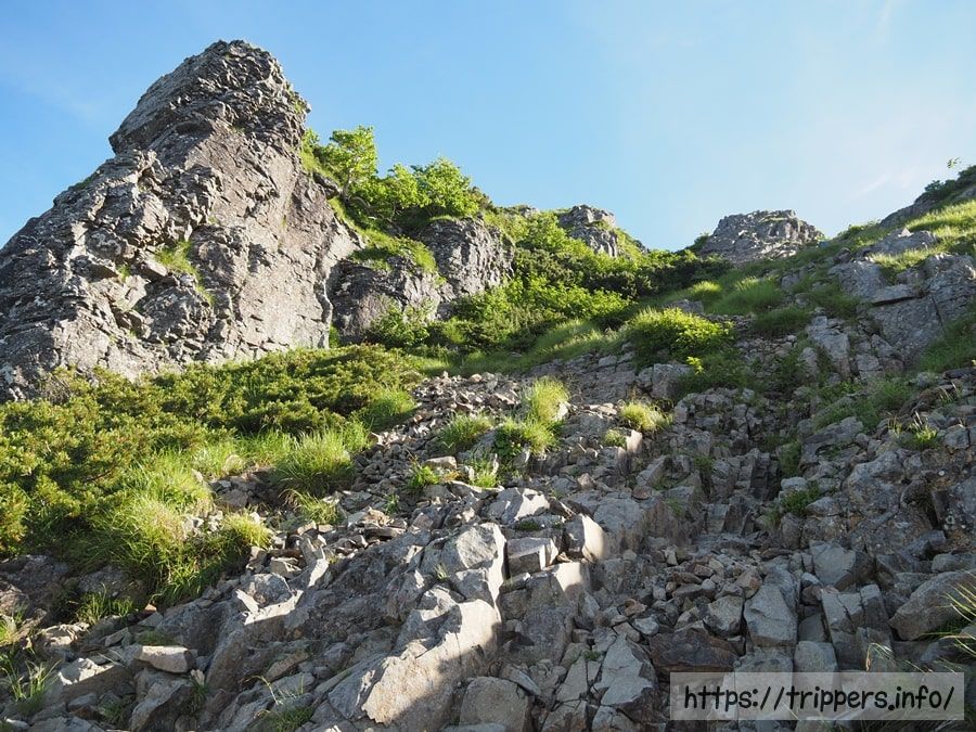 ここから本格的な岩場になります。かなりの角度がある急斜面ですが、足を置く場所は多いため難易度は見た目ほどありません。普通に登れます。