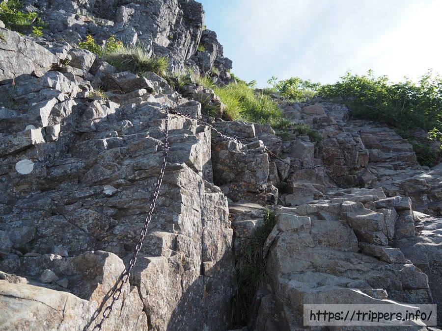 ほぼ垂直の壁ですが、足を置く場所があり、鎖もあるので問題ありません。ただ、どうやって通過すれば良いか分からない登山者を見かけたので、渋滞しやすい個所だと思います。
