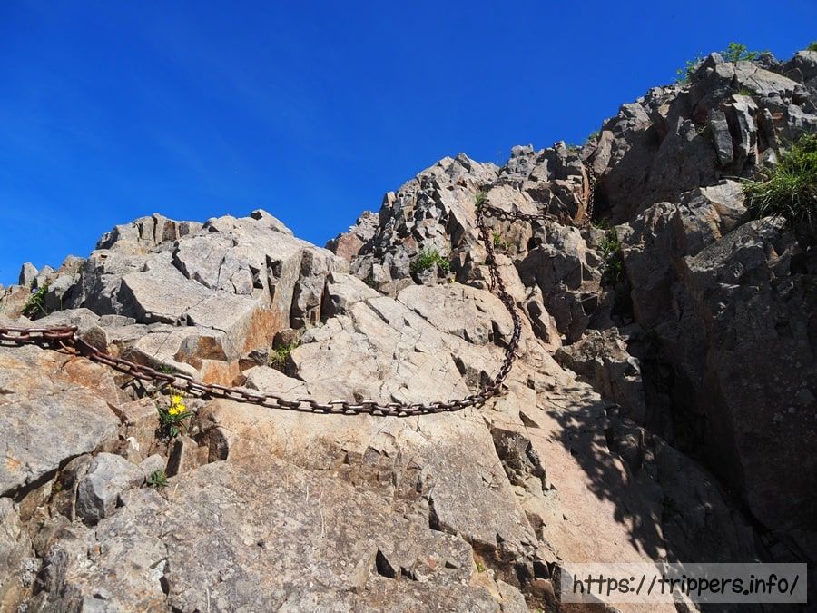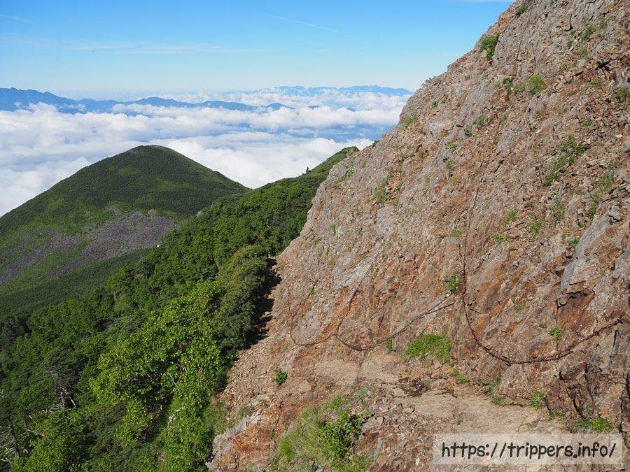 片側が崖になった、足幅の狭い登山道です。鎖の補助がありますが、足を滑らさないように進みます。雨で岩が濡れていたら要注意です。すれ違いが難しいので譲り合いが必要ですが、私が通った時は人がいませんでした。