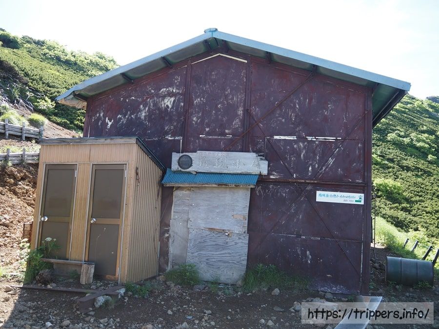 権現小屋に到着しました。去年も今年も営業していないため、ずっとしまったままです。営業を再開した時には、宿泊してみたいですね。青年小屋と同じ一家が経営しています。