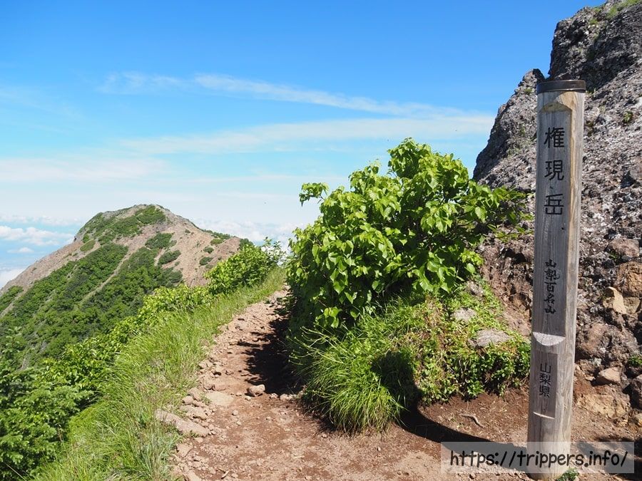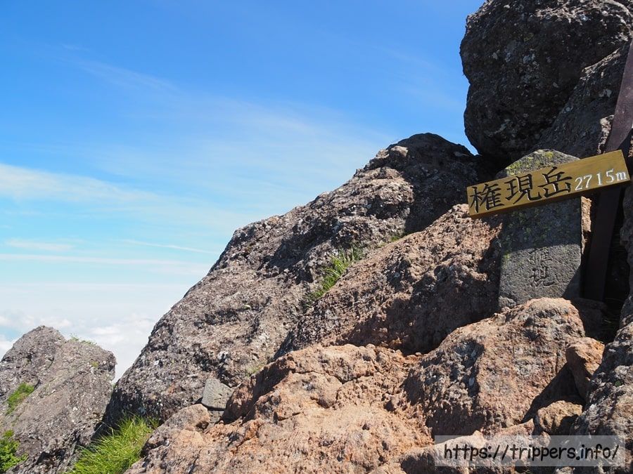 標高2,715mある権現岳の山頂に到着しました。頂上は岩場になっており、山梨県の標識から更に岩場を登る必要があります。