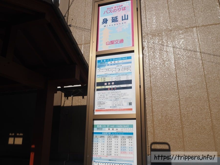 身延山バス停までは新宿から高速バスがあります。それ故か、身延駅から行きのバスはガラガラで、身延駅への帰りのバスは何とか全員座れる程でした。