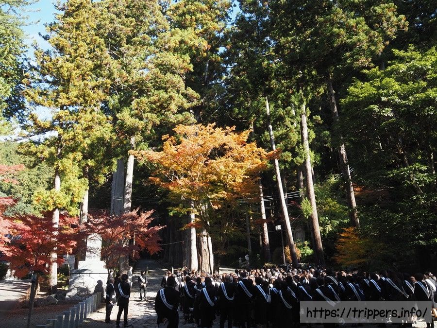 どこかの団体の参拝日イベントと被ったようです。佛所護念会教団でしょうか。男女交互に「南無妙法蓮華経」を言いながら久遠寺へ行列をなしていました。