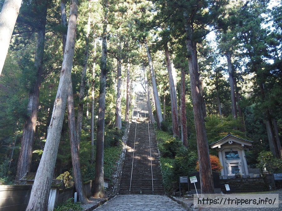 久遠寺への長い階段を上っていきます。287段あり高低差は104mです。菩提梯と呼ばれており、煩悩を断ち切って悟るための階段です。
