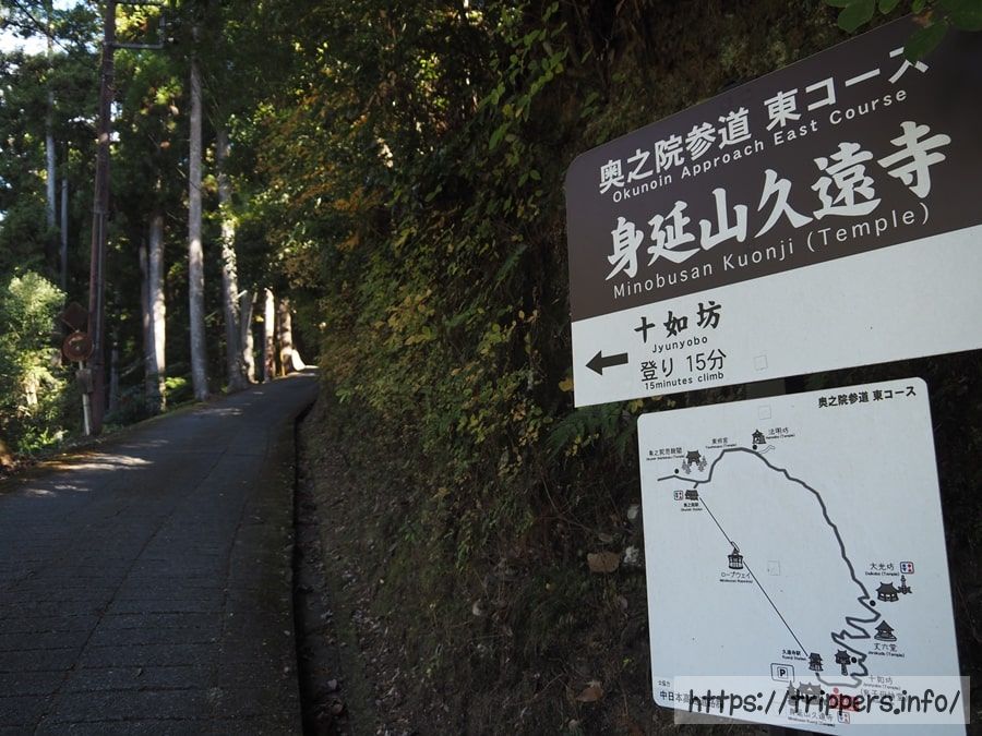 身延山の地図です。ロープウェイの右手には奥の院参道東コース、左手には西コースがあります。西コースから登ることも考えましたが、遠回りして時間が遅くなる可能性があったため、とりあえず東コースから登ります。