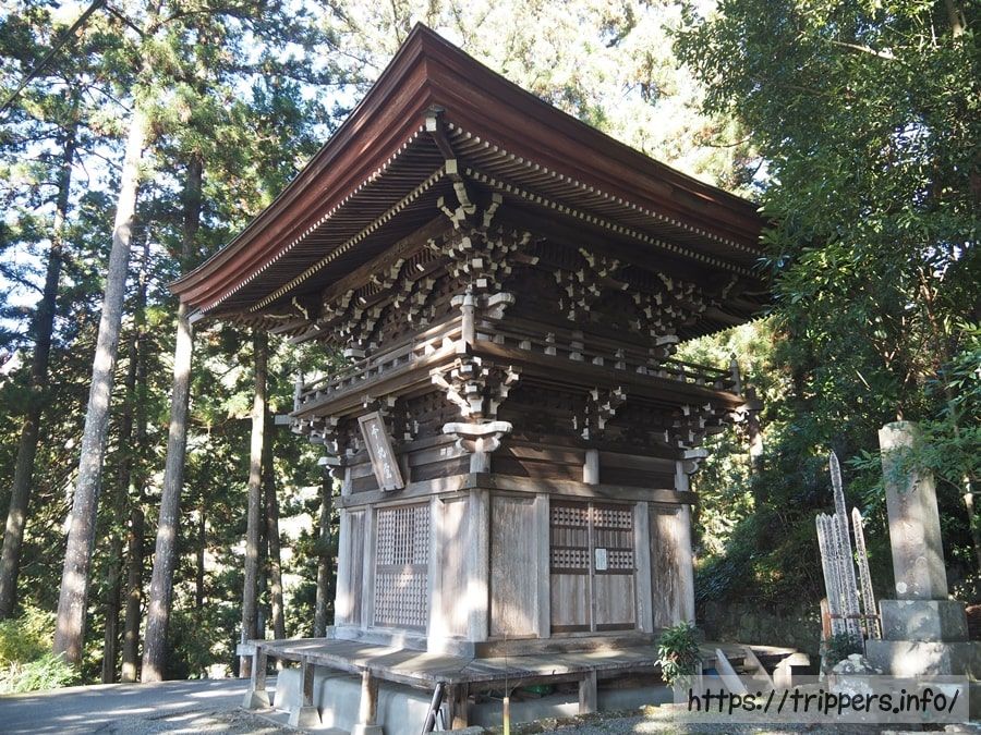 三光堂と久遠寺相輪塔です。トイレと屋根付きベンチがあるため、ここで軽食休憩にします。アスファルトの道路はここで終了になりますが、道はこの先も砂利道みたいに整備されています。