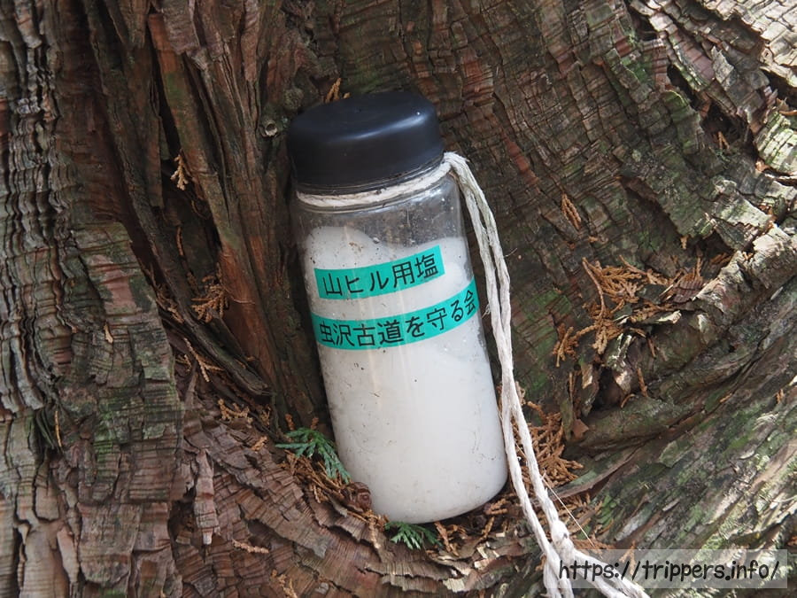 尺里峠へ下山を開始します。ヤマビルがくっ付いた時用の塩が道中に置いてありました。それだけヤマビルの生息数が多いということです。