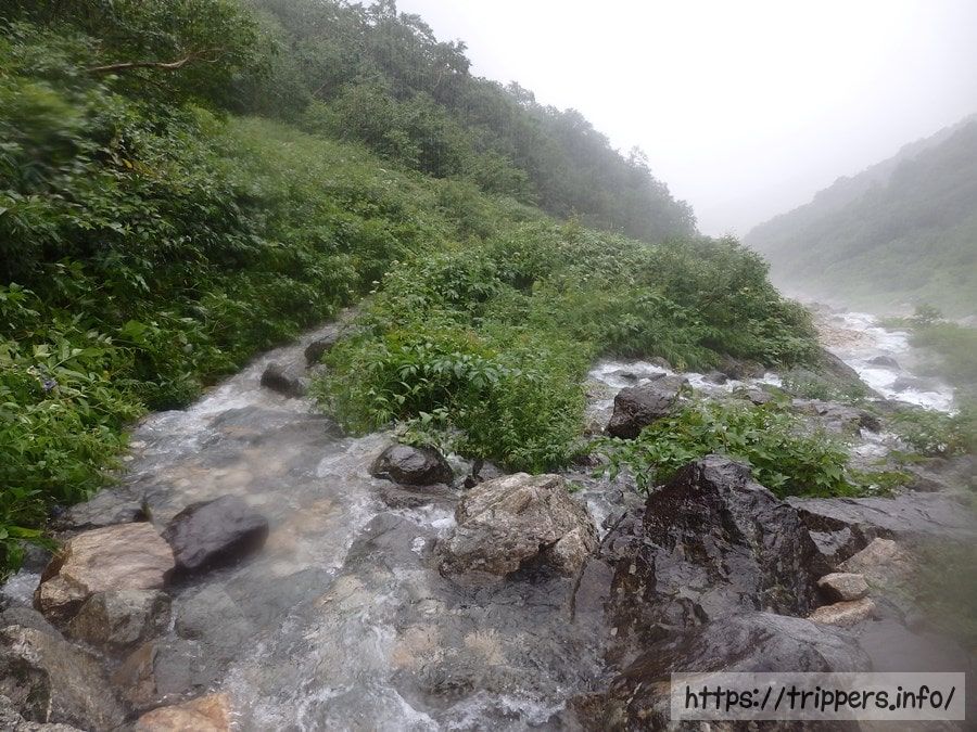 普段は安全で、山の緑と沢の音で癒してくれる沢沿いの登山道ですが、雨が降れば自然の恐怖がむき出しになります。「下界が雨なら、山では大雨」と言う言葉を何回も聞いた事がりますが、本当にその通りです。登山道は川になり、どれが道でどれが川か分からなくなります。渡渉(川を渡る事)も普段より危険度が高くなり、本来は靴を濡らさずに渡れた沢も、足首より上まで浸かってしまい、水の流れも強いので流されそうな恐怖です。私はいつもストックを使いませんが、いつも持ち歩いてます。ケガや疲労で歩けない場合、ストックがあるだけで歩けますし、増水した沢に遭遇した時、ストックがあるだけでより安全に渡渉できます。(そんな時は渡渉しないのが一番ですけれども。)