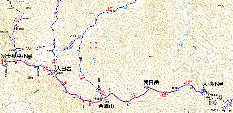 金峰山 → 1時間10分 → 朝日岳 → 50分 → 大弛峠(大弛小屋)