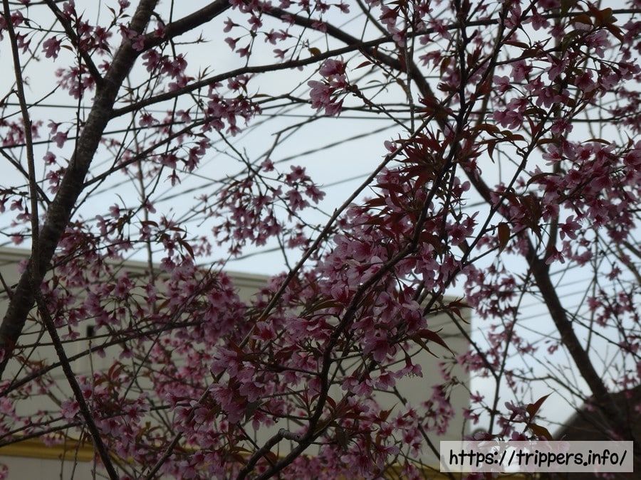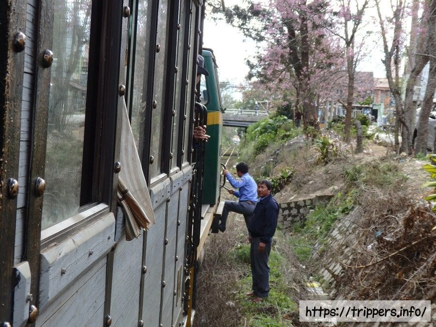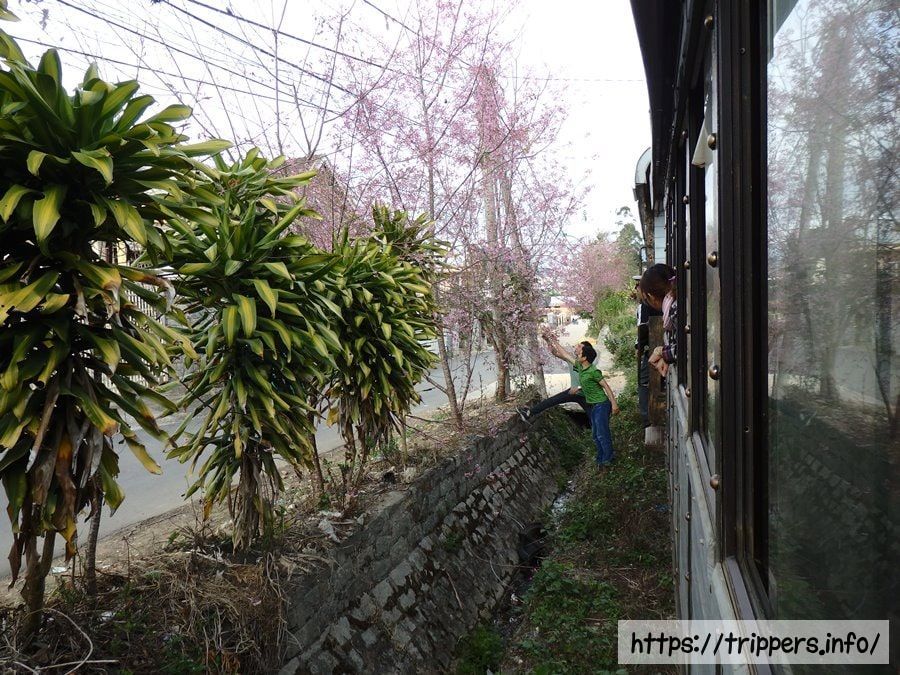 列車が故障中に桜の枝をお土産に取っています。