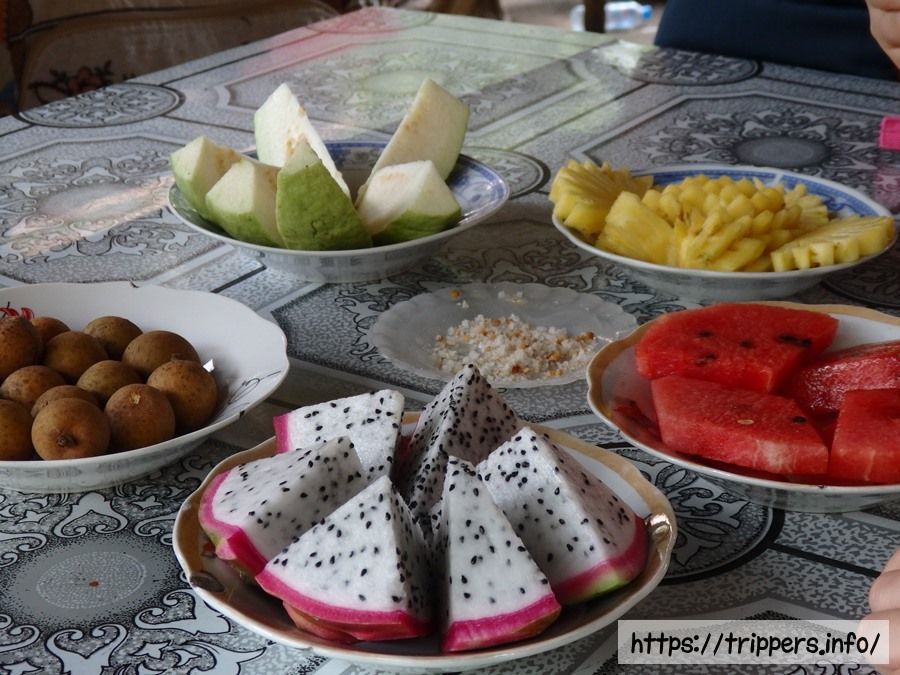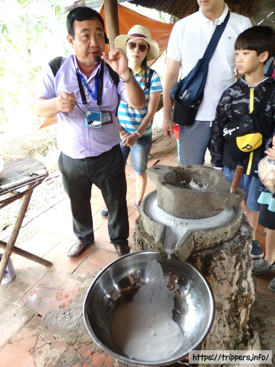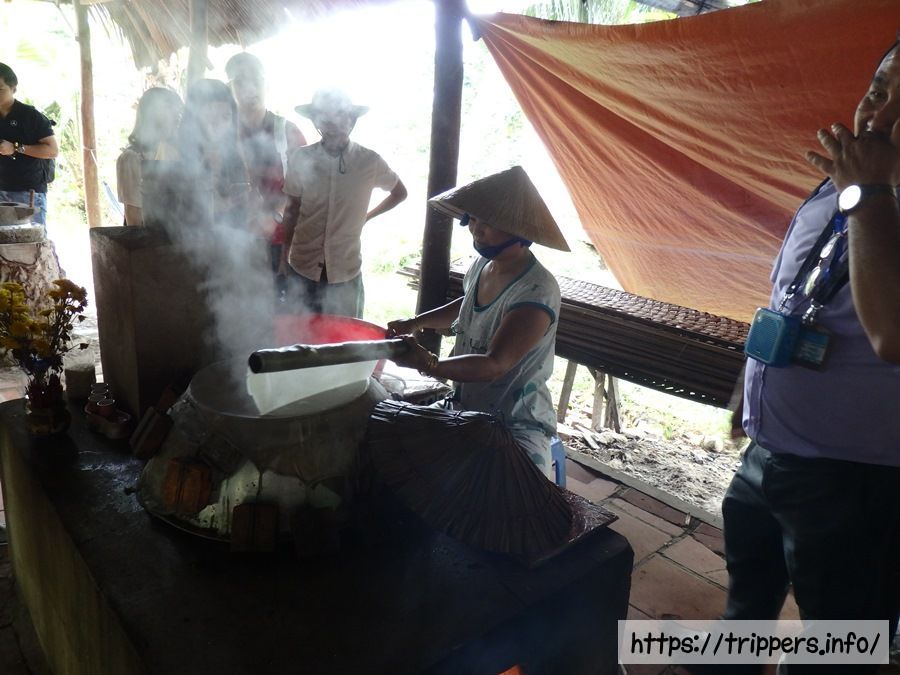 ライスペーパーはこの地域の名産品であり、ホーチミンやミトーで良く食べられます。ガイドの英語はジェスチャーと共に優しい単語でゆっくりなので聞き取りやすいですが、英語が分からなくても説明している物を見れば何が言いたいのか理解できます。