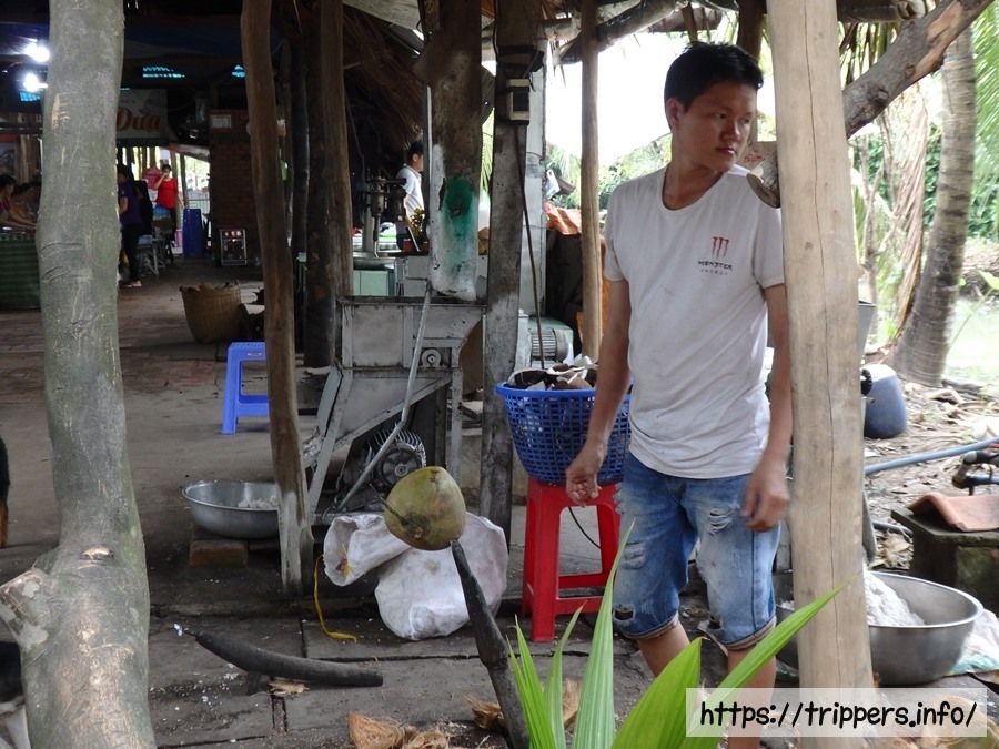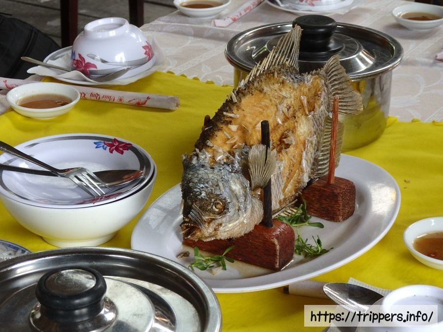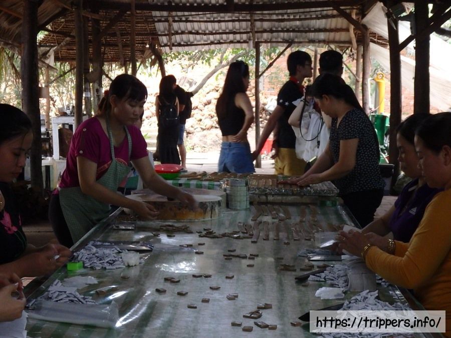 2つ目の島ではライスペーパーやココナッツキャンディー、木製の製品などお土産屋があり、立ち寄ります。そこでここの名産品であるココナッツキャンディーの試食もあります。お土産屋の側にあるレストランで団体での昼食です。メコン川に棲息するエレファントイヤーフィッシュの身を野菜と一緒にライスペーパーに包んだメニューがメインになります。食事量はあまり多くありません。