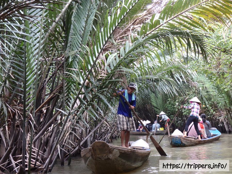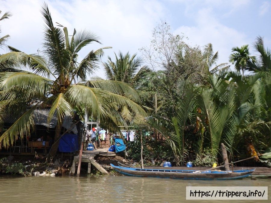最初は手漕ぎでとても情緒があり、想像していたメコン川クルーズが始まります。がそう思った瞬間、手漕ぎの小舟はエンジン音と共にモータボートになり、あっという間に終了になります。