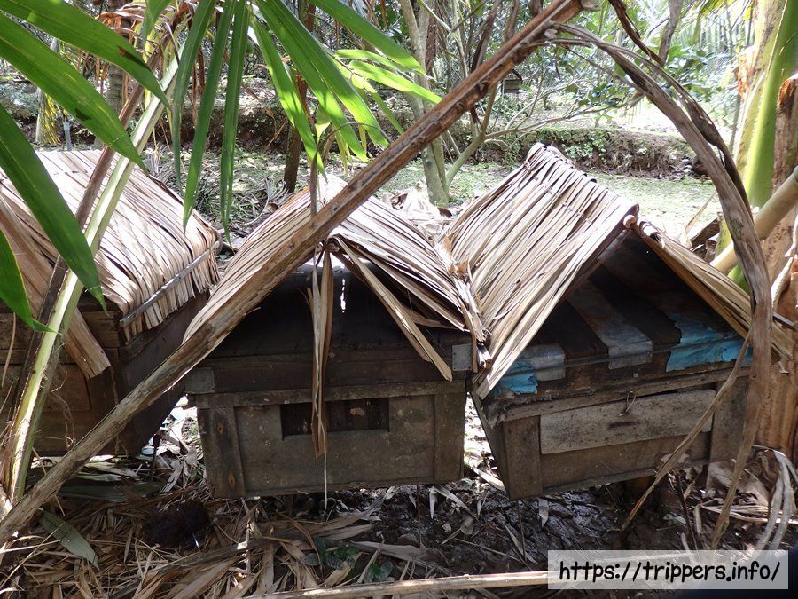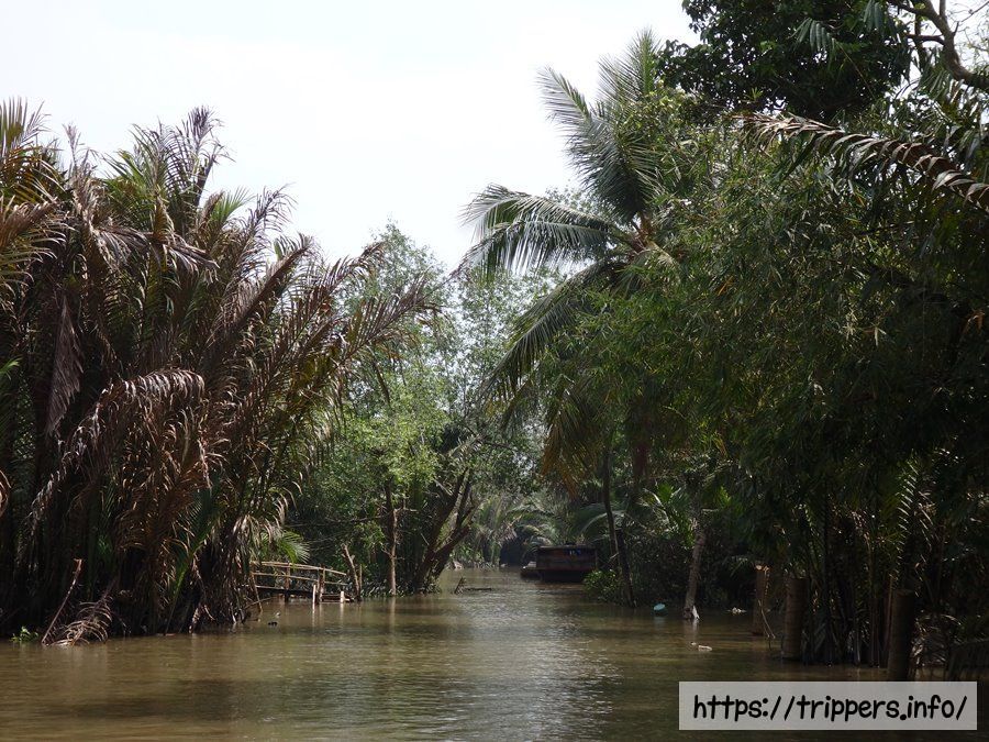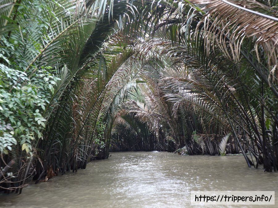 食事の後は養蜂の島へ移動します。ここからはメコン川の主流ではなく支流を移動するため、両脇がヤシの葉で覆われたところを船で進んでいきます。